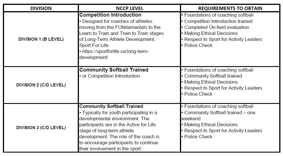 All teams U11 and up require a coach with their Community Softball Clinic (formerly NCCP Level 1) in order to compete in Provincials. Coaches are encouraged to get this as early as possible as coaching skills taught in this clinic are vital for player development at all levels.